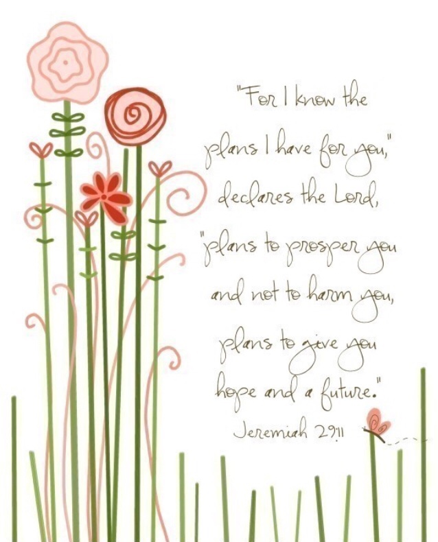 JEREMIAH 29:11< strong>For I know the plans I have for you,” declares the LORD, “plans to prosper you and not to harm you, plans to give you hope and a future.